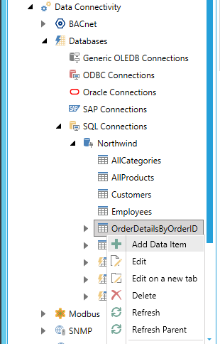 Expand your selected data connection and data source nodes. For instance, in the example below, we are adding a Data Item to a Data Source within the Northwind database found within the SQL Connections node. Right-click a Data Source, then select Add Data Item, as shown below.