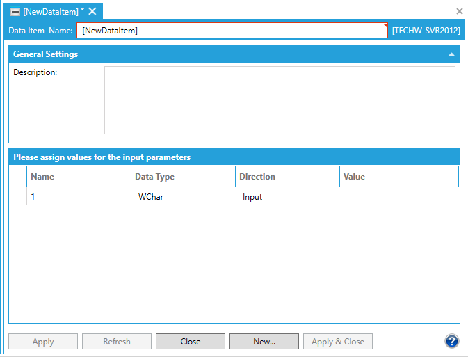 A data item is an instance of a data source with parameters already set. This gives you a way to assign a user-friendly name to customized data sources and use them without having to specify the parameter values.