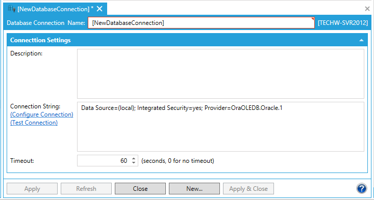 In Connection String, you can click on the Configure Connection link, which will open the Oracle OLEDB Connection String window, similar to the one shown below. Once you have entered the requested info, click OK to return to the connection properties.