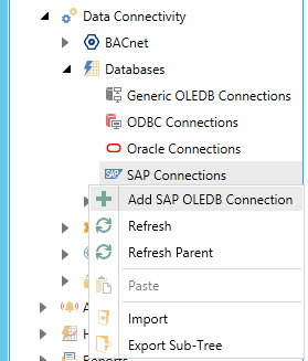 Right-click the SAP Connections node then click on Add SAP OLEDB Connection, as shown below.