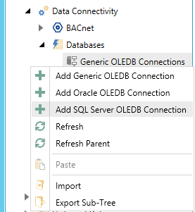Right-click the Generic OLEDB Connections node then click on Add SQL Server OLEDB Connection, as shown below.