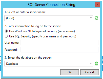 In Connection String, you can click on the Configure Connection link, which will open the SQL Server OLEDB Connection String window, similar to the one shown below. Once you have entered the requested info, click OK to return to the connection properties.