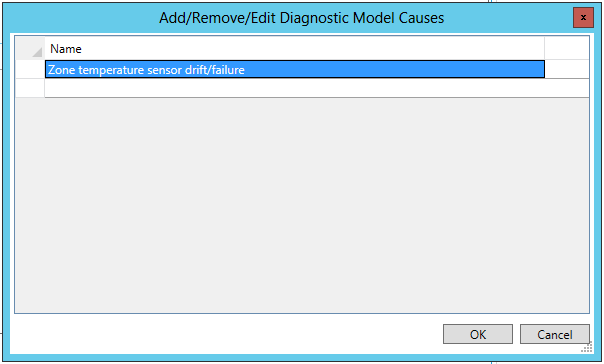 The following Add/Remove/Edit Diagnostic Model Causes window will appear. Your existing cause(s) will appear under the "Click here to add new item" selection at the top of the screen.