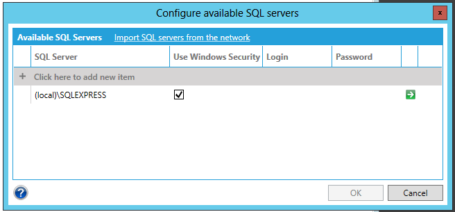 SQL Configuration - Clicking this option opens the Configure available SQL servers window (shown below). You can click on the Import SQL servers from the network link at the top to autopopulate the window with available SQL servers. Else, you can click on + Click here to add new item and then complete the required information (SQL Server, Use Windows Security, Login, Password). Click on the