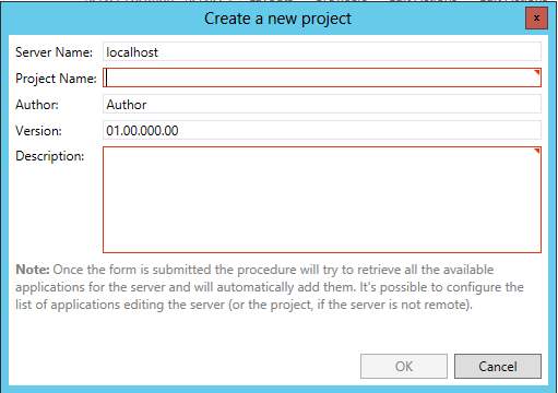 New Project - Clicking on 'New Project' brings up the Create a new project window, shown below. Within this window, you can enter new information in the text entry fields for Server Name, Project Name, Author, Version and Description. Note: Once the form is submitted, the procedure will try to retrieve all the available application for the server and will automatically add them. It's possible to configure the list of applications by editing the server (or the project, if the server is not remote).