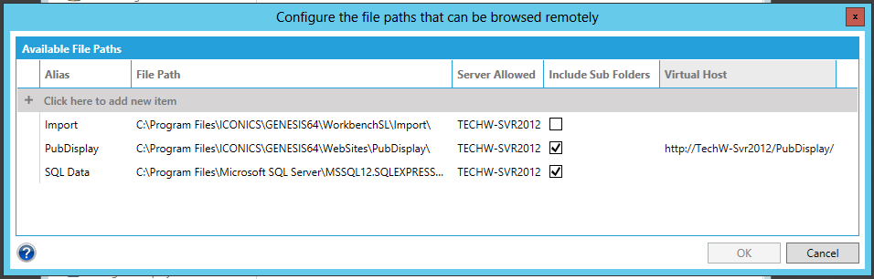 File Configuration - Clicking this option brings up the Configure the file paths that can be browsed remotely window (shown below), which allows you to set available file path aliases for frequently accessed file locations. Click on + Click here to add new item and you can set the Alias that can be used throughout various Workbench applications, the File Path for that alias, the Server Allowed where that file path can be accessed, whether to Include Sub Folders and a Virtual Host if you intend to access that File Path via a browser. Click OK to save your changes and to return to the Workbench.
