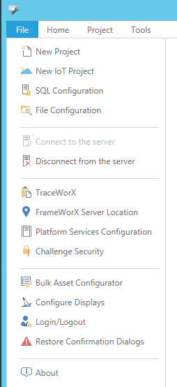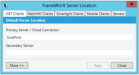 FrameWorX Server Location - Clicking this option opens the FrameWorX Server Location window, shown below, which allows you to set default FrameWorX server location. Click HERE for more information on the FrameWorX Server Location.