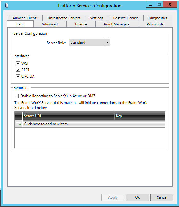 Platform Services Configuration - Clicking on "Platform Services Configuration" brings up the Platform Services Configuration window, shown below, where users can update various settings that are used throughout their installed ICONICS components. Click HERE for more information on Platform Services Configuration.