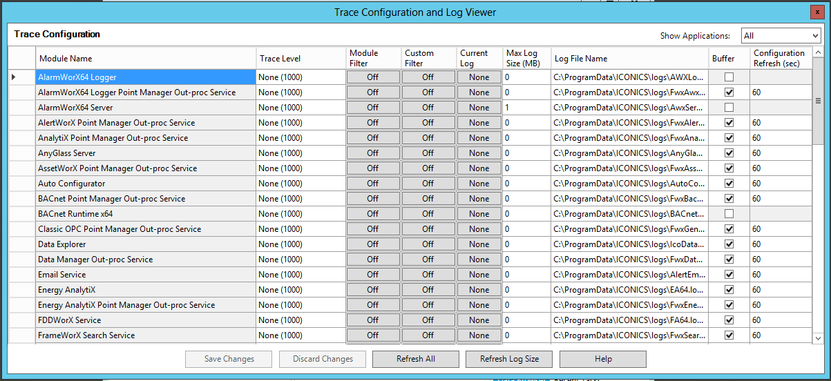 TraceWorX - Clicking on "TraceWorX" opens the Trace Configuration and Log Viewer window (shown below) in order to perform troubleshooting for connected ICONICS components. Click HERE for more information about TraceWorX.