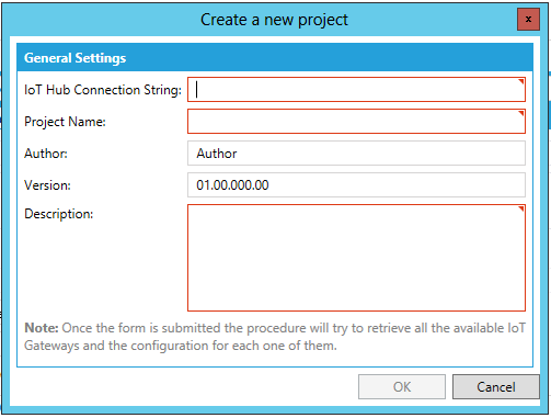 New IoT Project - Clicking on this option creates a new IoT project that can be used to manage IoT Gateways. Within the Create a new project window, you can enter the IoT Hub Connection String, the Project Name, Author, Version and Description. Note that once the form has been submitted, an attempt will be made to retrieve all available IoT Gateways and their configurations.