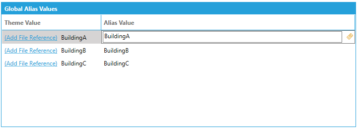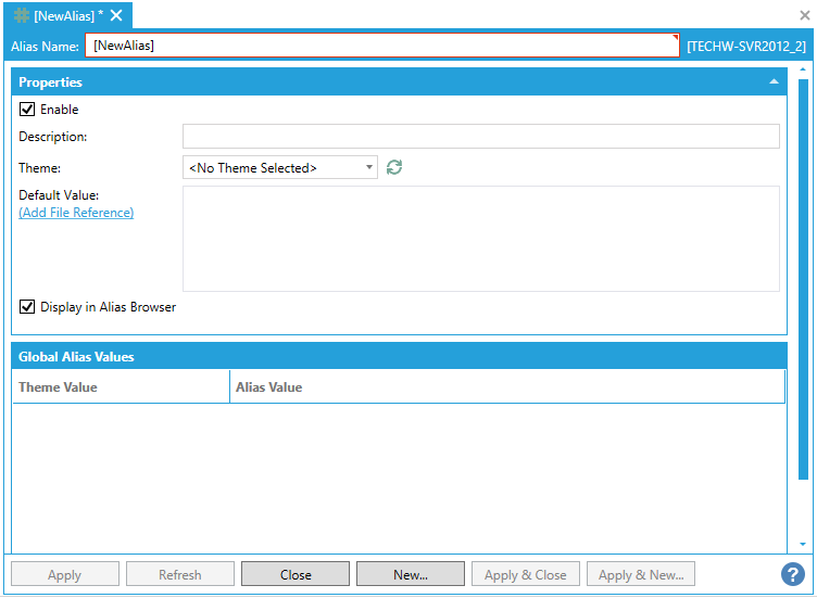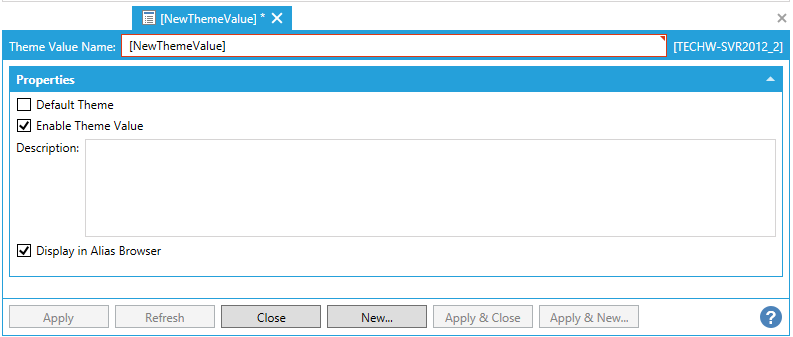 Optionally, select a Theme from the dropdown list box. Themes are described in more detail in the topic Working with Themes that follows, and they define a set of a aliases with the same set of properties. Should your selected theme contain connected theme values, they will appear in the Theme Value/Alias Value section at the bottom of the window.