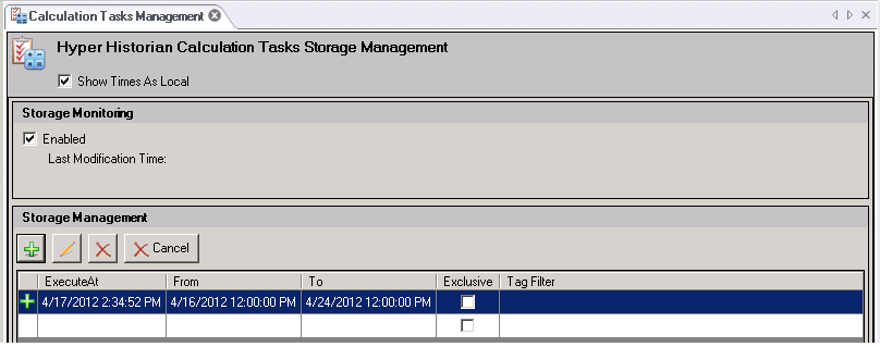 In Hyper Historian, calculated tags are calculated in accordance with their triggers on an ongoing basis. There may be a time at which you will want to recalculate the calculated tags that are already stored in Hyper Historian, for example after new historical data is added or historical data has been updated. You can recalculate calculated tags by using the Calculation Tasks Management form (shown below), available in Hyper Historian under the System Administration node. You can schedule a task to run at a specific time in the future, or you can run it immediately.