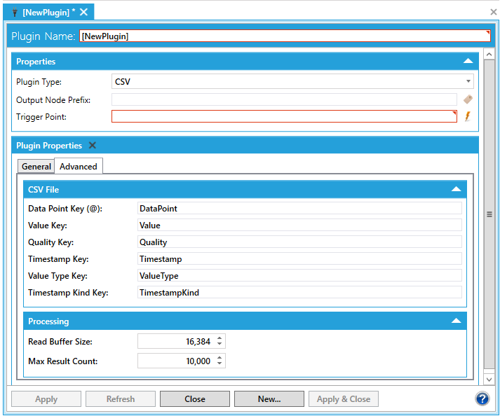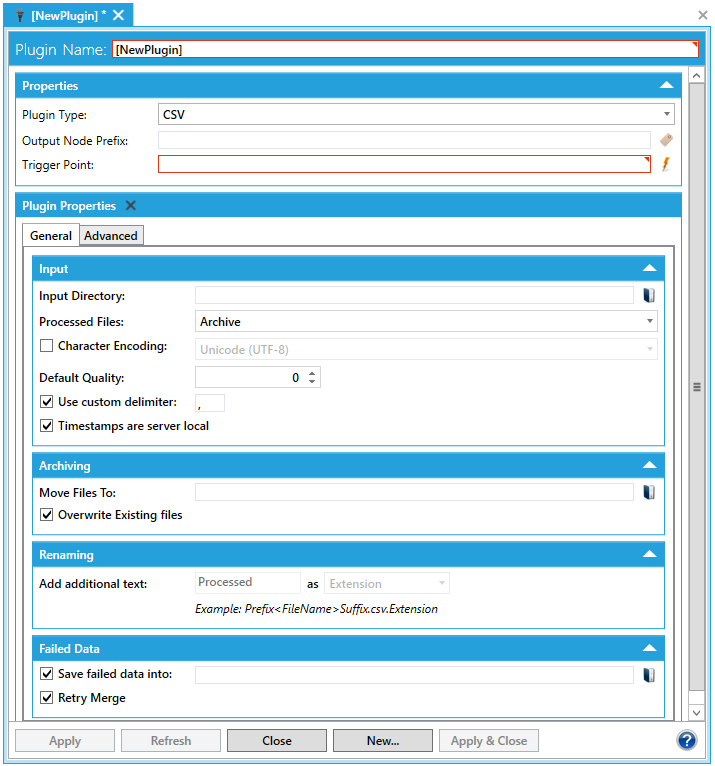 If you have already selected a Plugin (from Step 3 above), you'll notice that the Plugin Properties section contains two tabs: General and Advanced. In the General tab, in the Input section, you can use the Input Directory field to locate and select the location of the CSV file that contains the data to be merged into Hyper Historian. Click on the