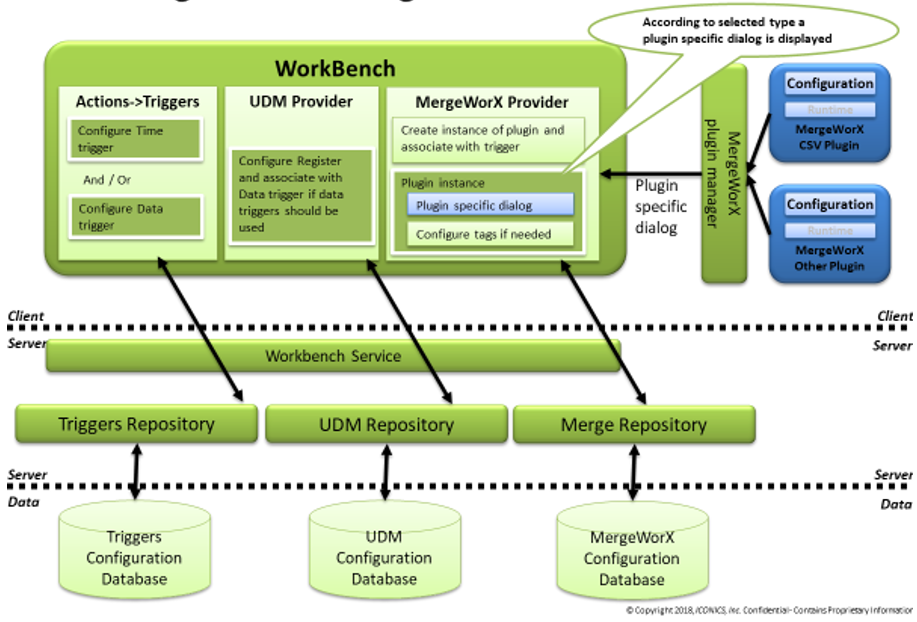 Configuration of MergeWorX is done through the Workbench. The user creates a configuration database for the MergeWorX engine and defines the plugin instances. Each plugin instance must have a trigger defined. On the screen of plugin instances, there is also a plugin specific part. This part is a dialog retrieved from the plugin. It is using a list of generic settings. A setting is a pair of setting name and value. All of these settings are stored in the MergeWorX database and are provided during runtime to the plugin. The setting type also includes a byte array, allowing you to store any configuration.