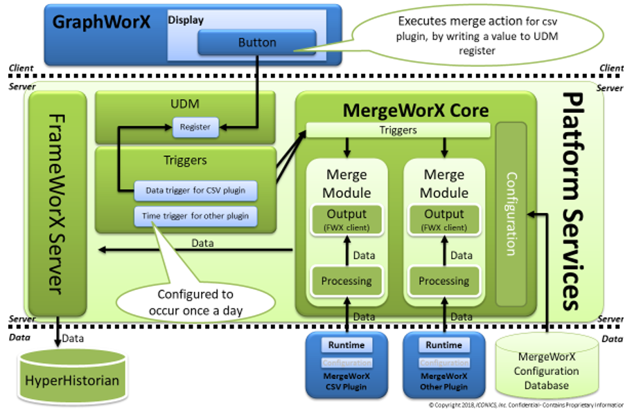 MergeWorX is an event-driven tool and uses ICONICS' Unified Data Manager (UDM) triggers for initiating data-merging. Currently there are two types of triggers: time-based and data-driven. This allows you to automate data merges for unattended operation, while still giving you the option to manually initiate data merges simply with the click of a button. Consequently, you can have multiple instances of the same plug-in, each fired by its own trigger, and each processing data from a different PLC, device, or source.