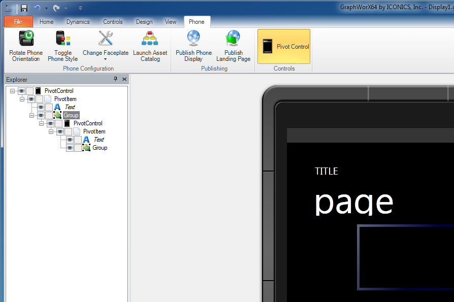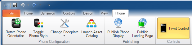 - On your computer, open GraphWorX64 for MobileHMI through the Start Menu > All Programs > ICONICS > MobileHMI or open a new display in GraphWorX64. Select the MobileHMI Configuration tab and click the Pivot Control icon.
