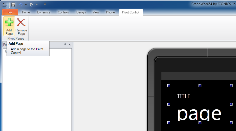 - The word "page" beneath "TITLE" acts as a place holder. Modify this page to create your Pivot Control. Each Pivot Control item or page contains a GraphWorX64 canvas and therefore allows you to draw objects within the bounds of the screen.