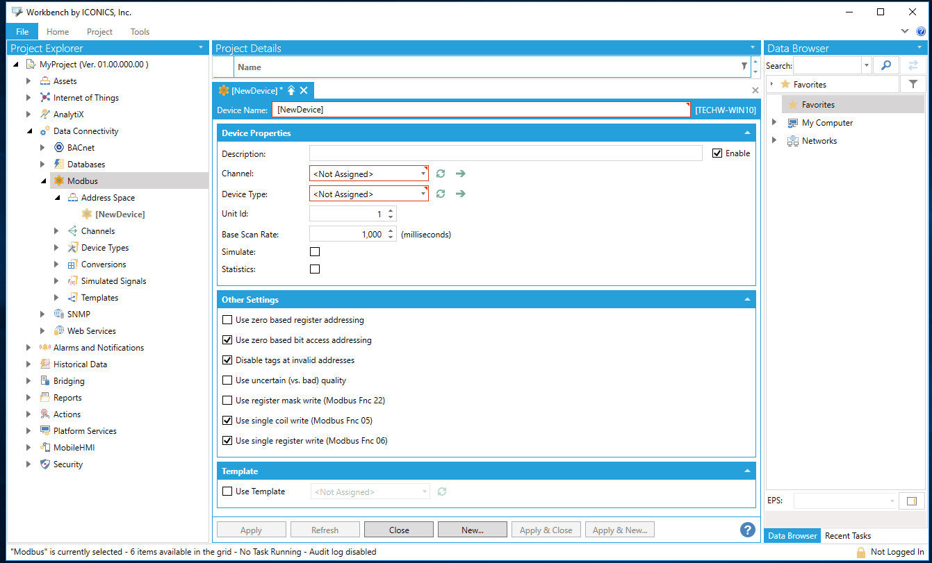 The Address Space tree control in the Modbus Configurator, shown in the figure below, sets the properties and connection parameters for the following items: