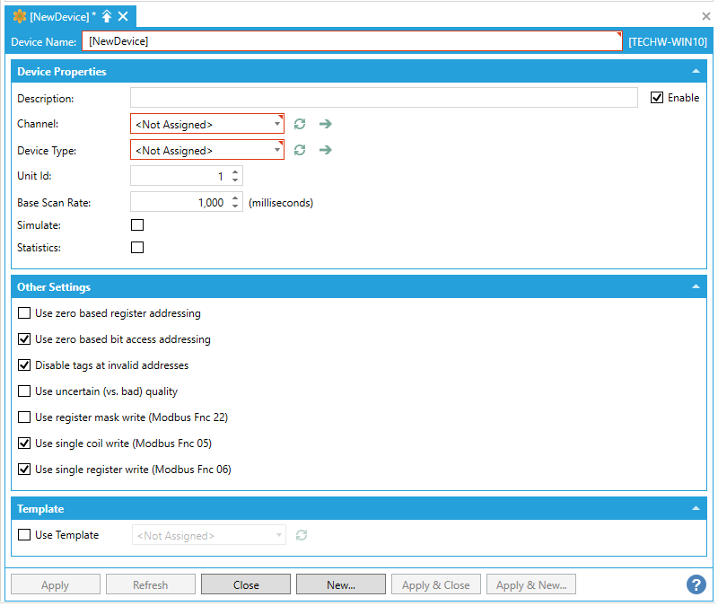 This opens the New Device properties in the right side of the configurator, as shown below. In the Device Name field, specify a name for the new device.