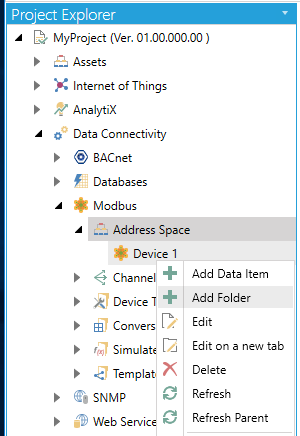 From the Project Explorer, click on an item within the Address Space node, then Add Folder, as shown below.