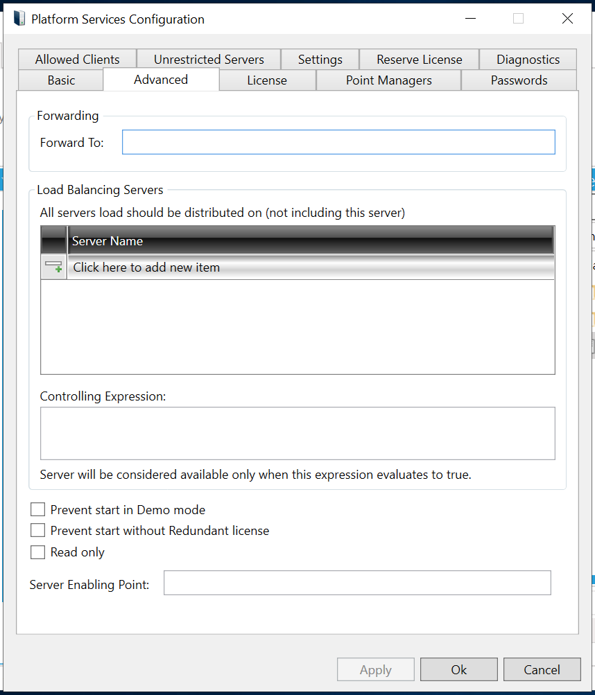 When an expression is entered in this text entry field (and any current changes to Platform Services Configuration are applied), the server will be considered available only when the entered expression evaluates to True.