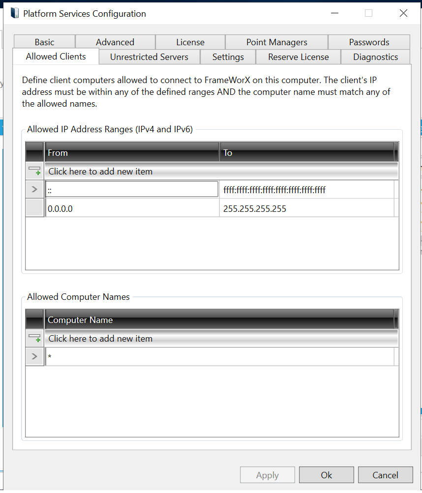 The Allowed Clients tab allows users to define which client computers are allowed to connect to the FrameWorX Server. Clients from other nodes will not be allowed. The client computer must match both lists: the Allowed IP Address Ranges (IPv4 and IPv6) and the Allowed Computer Names. Use * for any name. Use IPv4 and IPv6 addresses (Windows uses IPv6 internally). All clients are allowed by default.