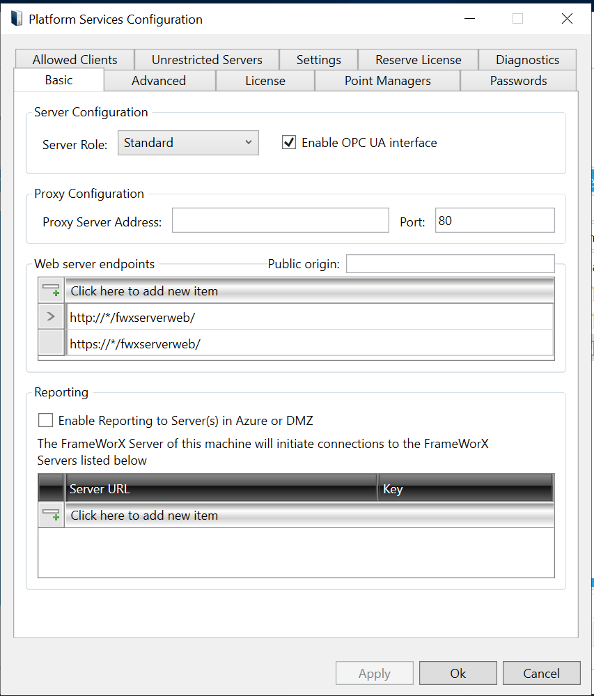 In the Interfaces section of the Basic tab of the Platform Services Configuration window, you can specify, via checkbox, whether or not to use the WCF, REST, or OPC UA interface.