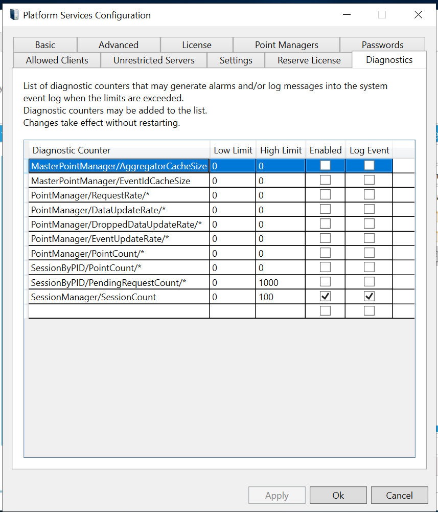 The Diagnostics tab allows you to set properties for Diagnostic Counters. These Diagnostic Counters may generate alarms and/or log messages into the system log when their limits are exceeded. You can set a Low Limit or High Limit for any selected Diagnostic Counter and can add Diagnostic Counters by typing within the empty text entry field at the bottom of the list.