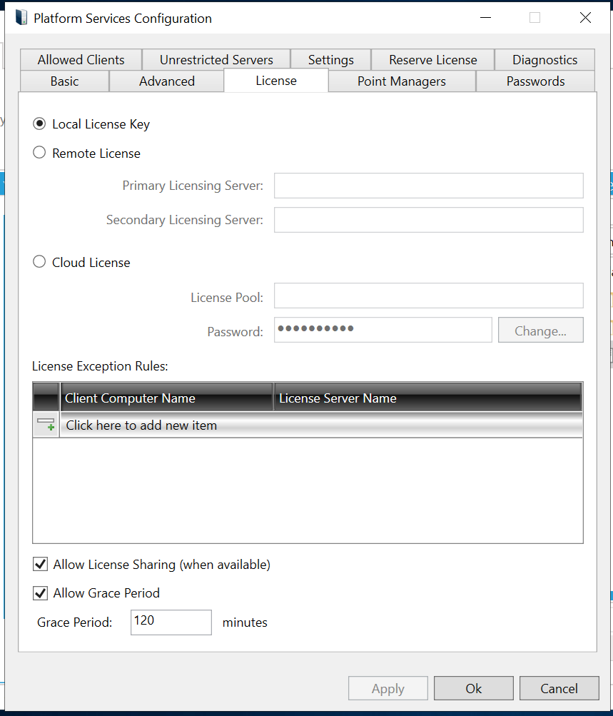 Allow Grace Period - Click this checkbox in order to allow for a license grace period. Once activated, you can set a period of time (in minutes) in the text entry field.
