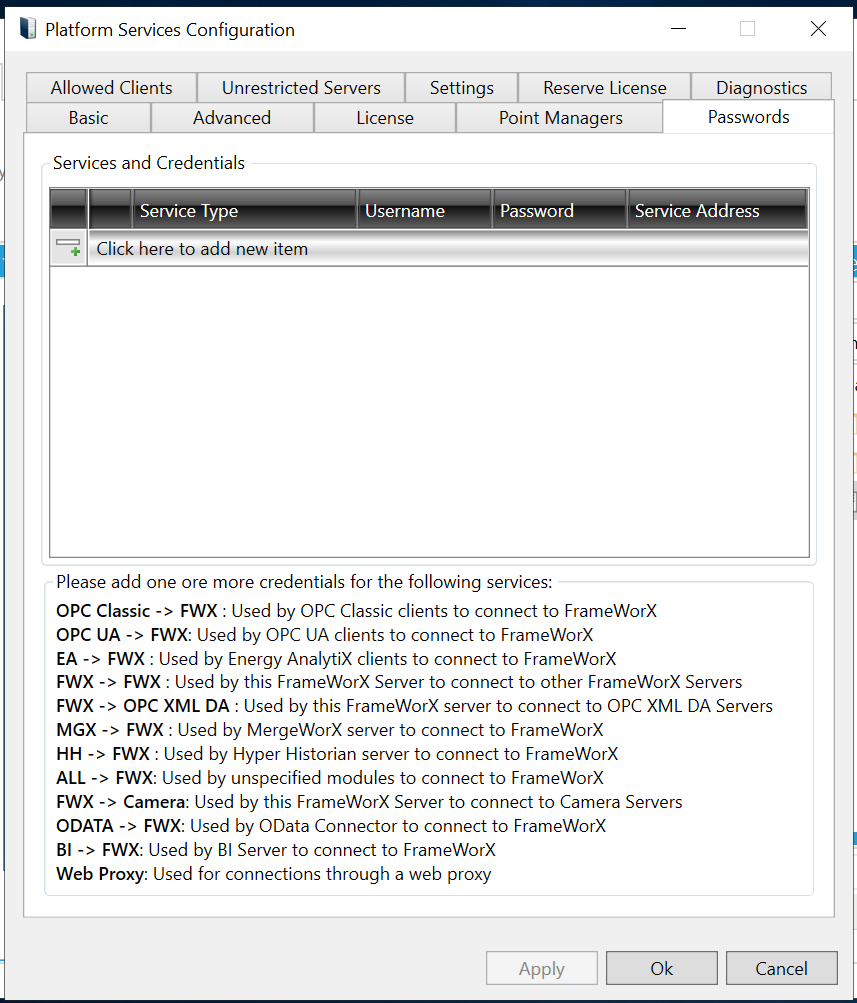 The Passwords tab allows users to specify credentials for different modules to connect to various servers. Currently, FrameWorX Servers and OPC XML DA servers are supported. Use * for the credentials to be used for all target addresses. These credentials are used for the modules running on the local computer.