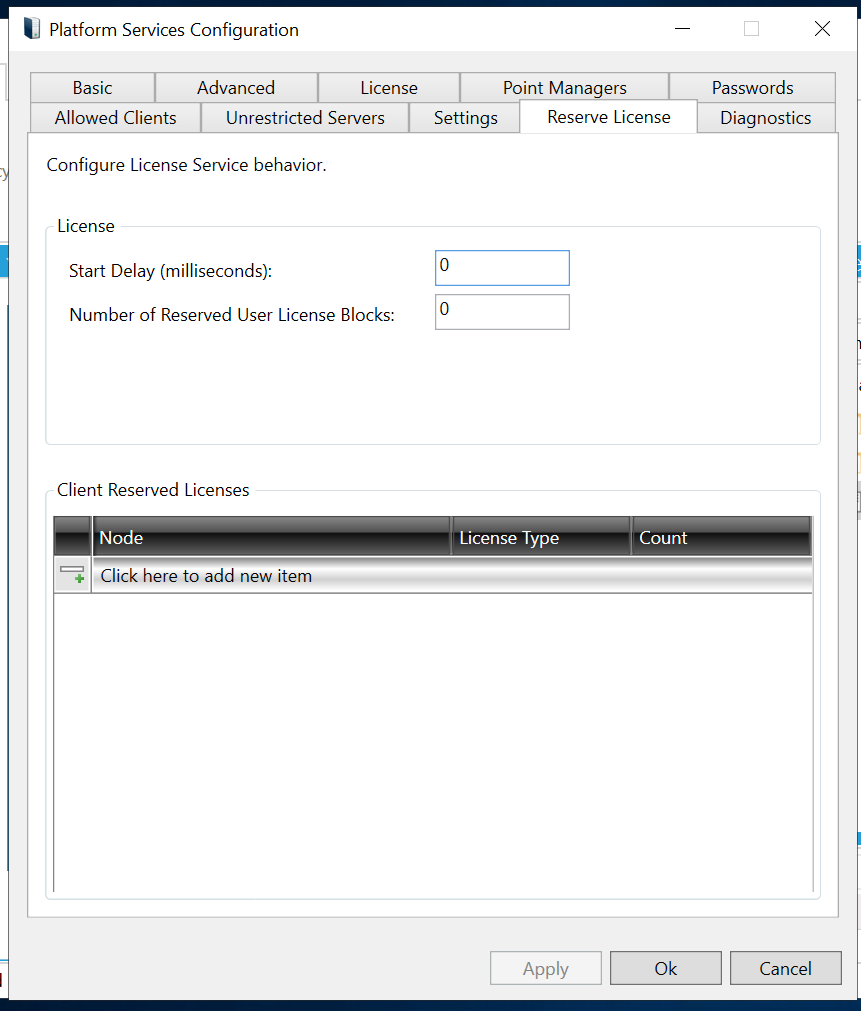 The bottom Client Reserved Licenses section allows users to pre-allocate license types to a specific node. Enter a Node and then select a specific License Type and then enter a number in the Count column for the number of pre-allocated licenses to reserve for that node (in most cases, the Count number will be 1).