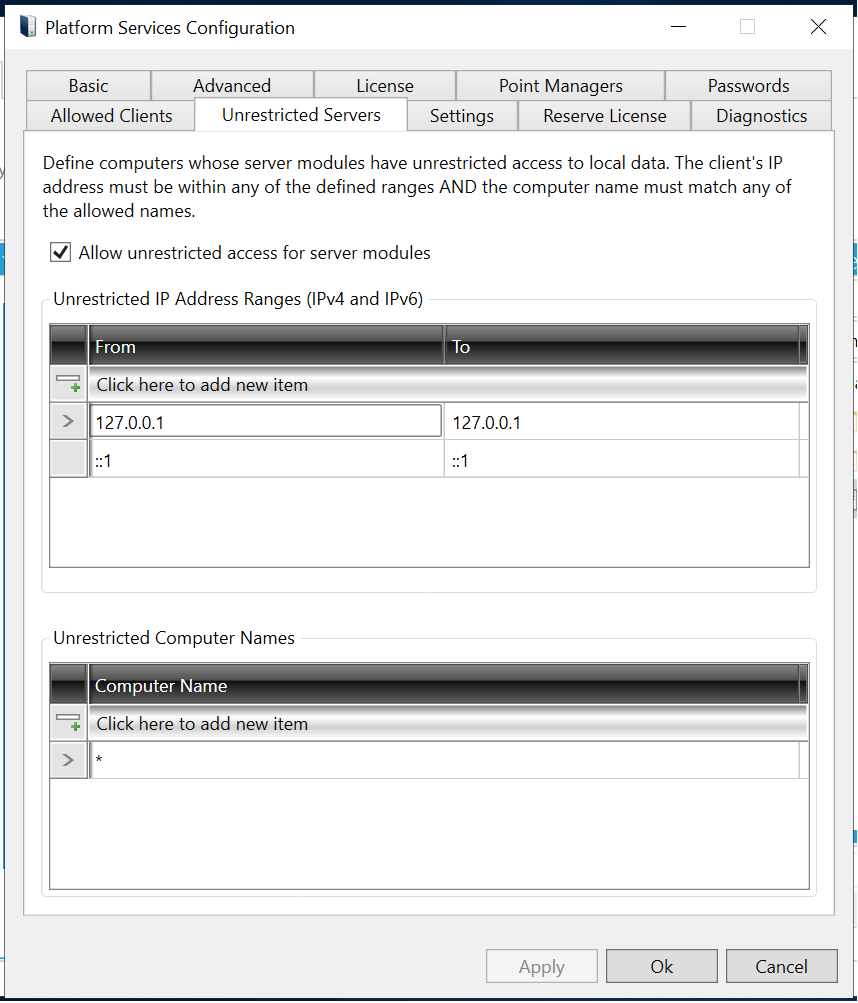 The Unrestricted Servers tab allows users to define which FrameWorX Servers (acting as clients) can connect to the FrameWorX Server with no security restrictions. The client computer must match both lists: the Unrestricted IP Address Ranges (IPv4 and IPv6) and the Unrestricted Computer Names. Use * for any name. Use IPv4 and IPv6 addresses (Windows uses IPv6 internally). Unrestricted access is only allowed for other FrameWorX Servers acting as clients. There are no unrestricted clients by default.