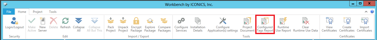 1. Click on the Configured Tags Report button in the Tools section of the Home ribbon in the Workbench.