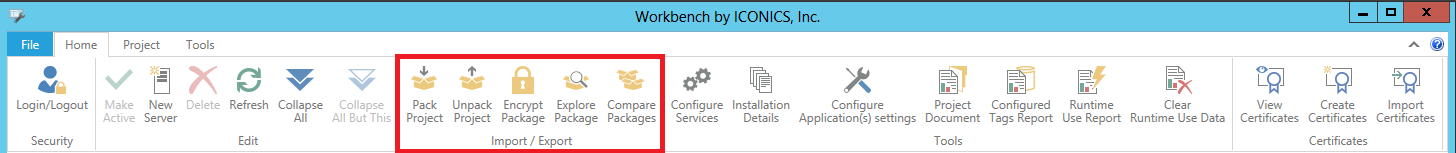 The Import/Export section of the Home Ribbon in the Workbench allows users to utilize packages of projects for future use, potentially on the same or different machine(s), for Runtime use or for further Configuration.