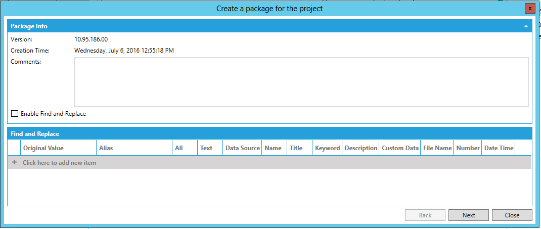 The Create a package for the project Window will automatically show the Version, Creation Time, and Comments from the selected packed project.