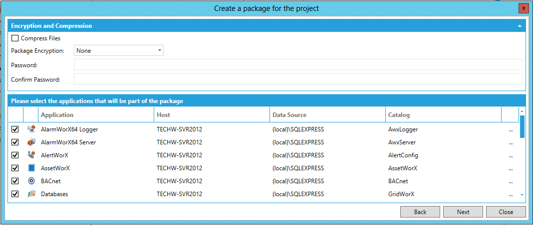 Encryption and Compression and Application Selection Settings in the Create a package for the project Window