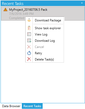 Right-click Options for a Pack Task in the Recent Tasks Panel