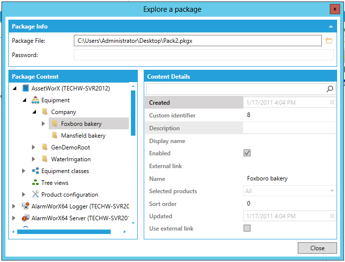 Some items in the Package Content section that provide Content Details properties can be expanded further, similar to how they would act within the Workbench's Tree Explorer. The example above shows the AssetWorX provider expanded to show the branch "Company" and the selected sub-branch "Foxboro bakery", which is populating the Content Details section.