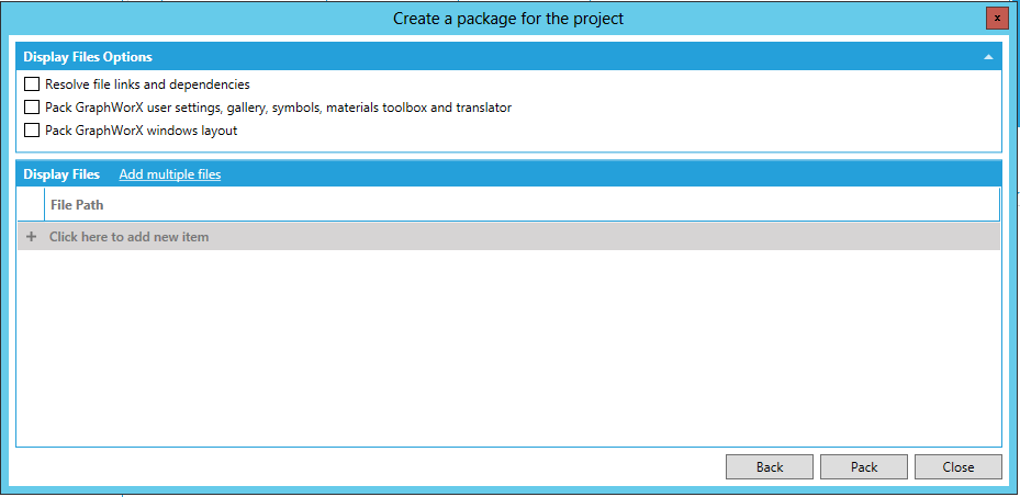 1. The Create a package for the prokect window then shows the Display Files Options and the Display Files settings, as shown below.