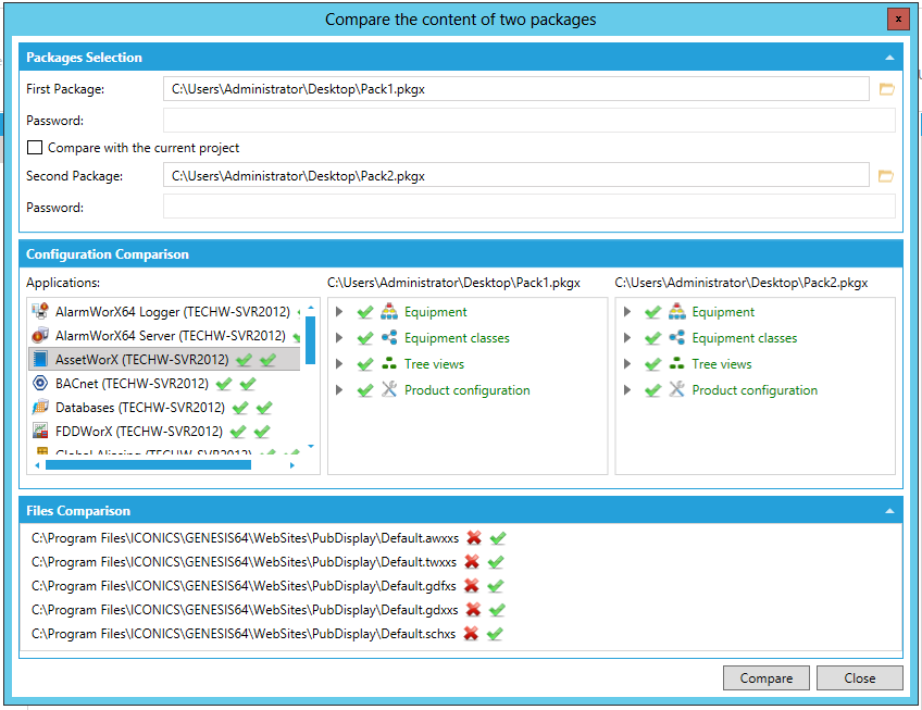 The Configuration Comparison section will then display the common items within both projects. In the Applications section, each application will be listed and a green checkmark denotes if either package contains that application, in order of selected packages (First Package then Second Package, or First and Current Project [which will be shown with its provided project name]). If a selected project does not contain that application, that is denoted by a red 'X' (). The example below shoes the AssetWorX component highlighted with two green checkmarks . This signifies that the First Package ("Pack1") and the Second Package ("Pack2") both contain the AssetWorX application.