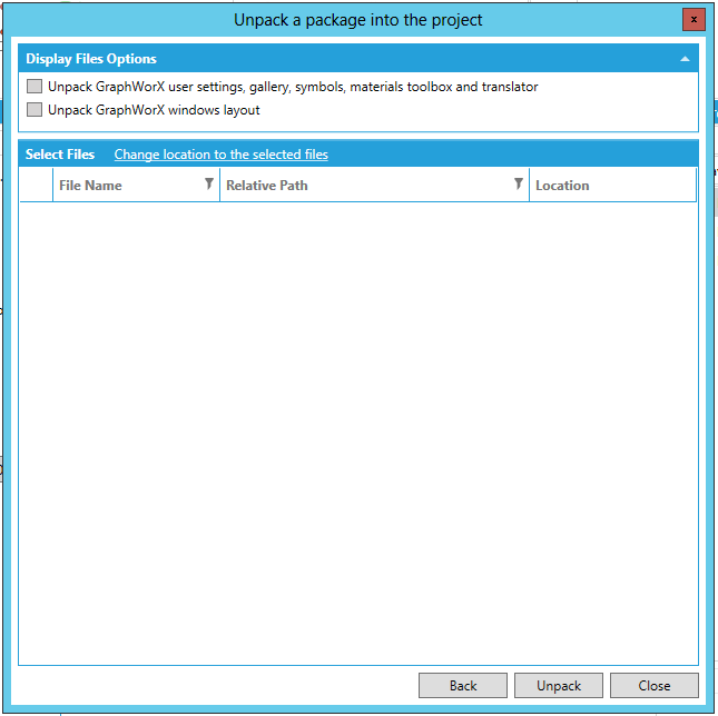 You can then opt to Unpack GraphWorX user settings, gallery, symbols, materials toolbox and translator and/or Unpack GraphWorX windows layout.