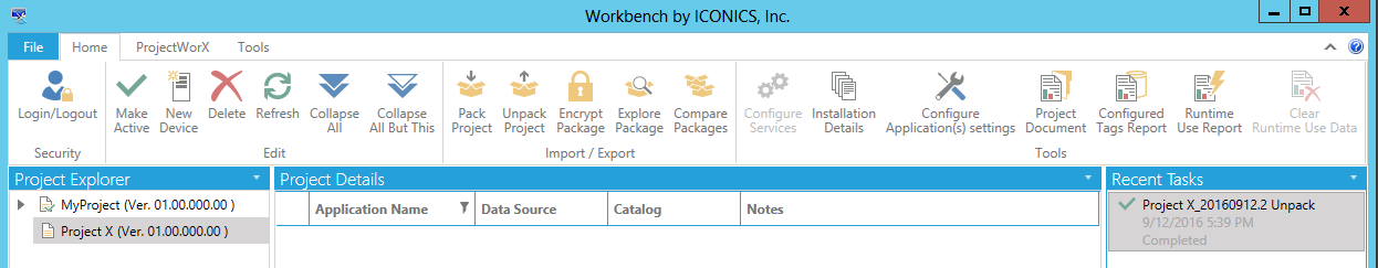 1. First, select the location in the Workbench where you would like the yet-to-be-selected package to be unpacked, then click on the Unpack Project button in the Import/Export section of the Home ribbon in the Workbench, as shown below.