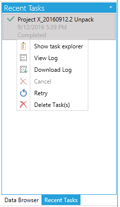 Right-click the task in the Recent Tasks panel to see related options, as shown below. Note: These are the same options (except for 'Show task explorer') that are available for the same task type in the Task Explorer.