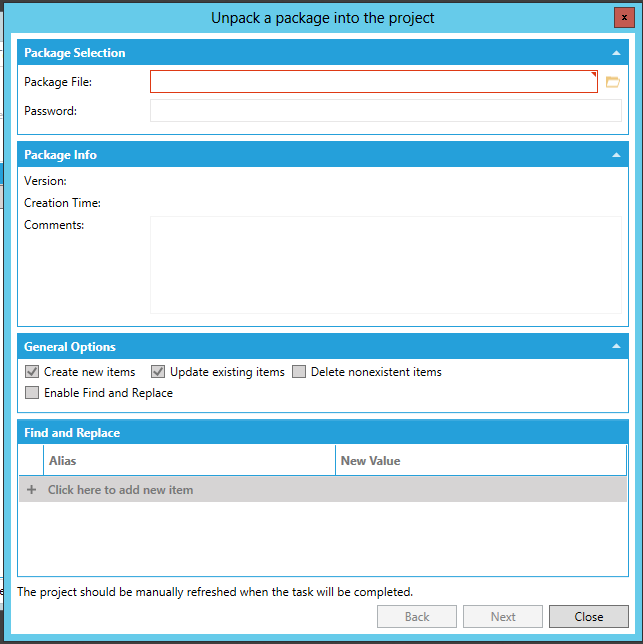 Note that the project in the Workbench into which the unpacked project will be inserted should be manually refreshed once the unpack task is completed.