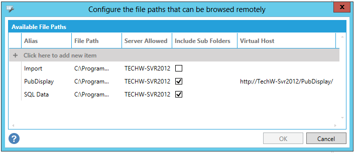 The File Configuration button allows you to set available file paths to data that can be browsed remotely. Clicking on the button brings up the Configure the file paths that can be browsed remotely window, as shown below.
