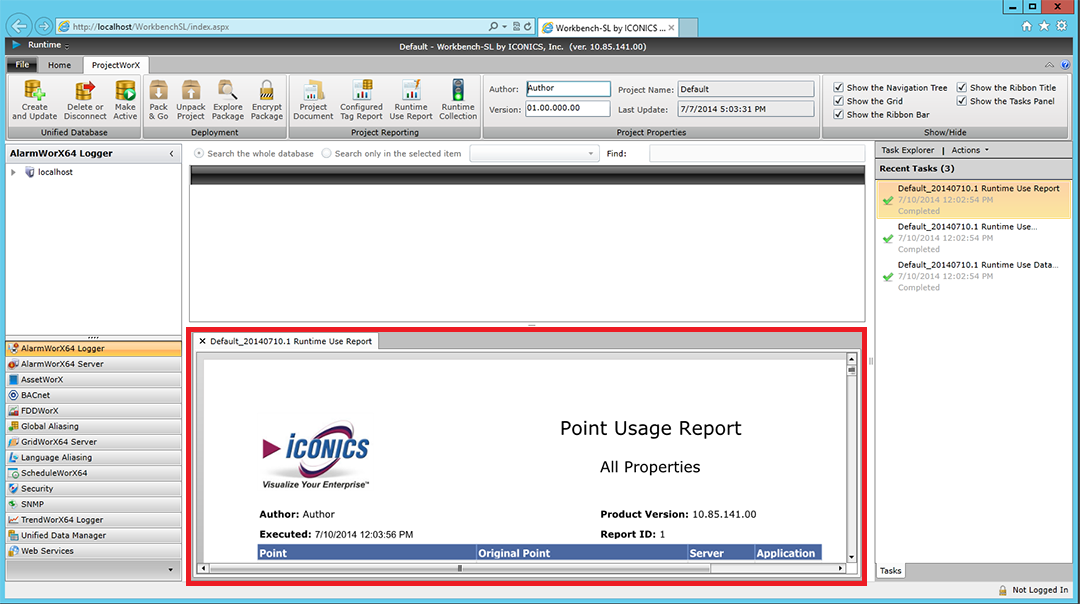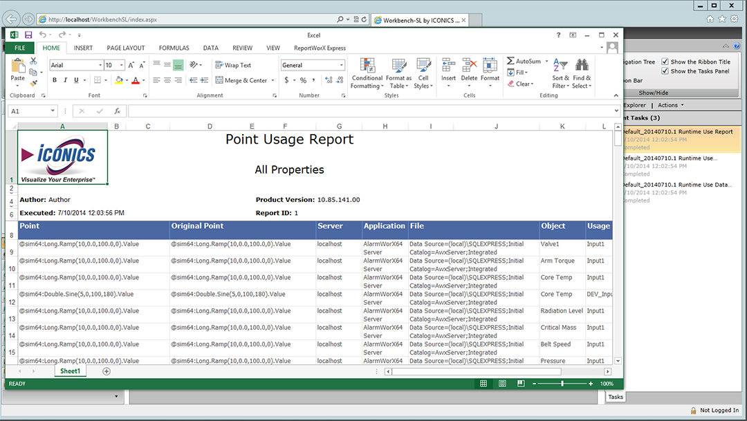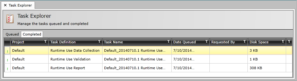 1. The Runtime Use Report Wizard then proceeds to create your requested report. Reports are generated asynchronously on the server. You will see the report's status appear in the Task Panel on the right side of the Workbench, as highlighted below.