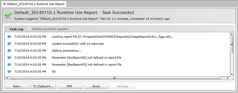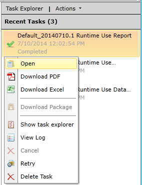 1. You can right-click on the completed Runtime Use Report task in the Tasks Panel for additional options, including Open, Download PDF, Download Excel, Show task explorer, View Log, Retry and Delete Task. [Note: The same right-click options are available when viewing the task within the Task Explorer.]
