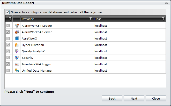 The configurations listed may differ, depending on the template you selected in Step 3. This optional step allows you to select the providers in the Workbench to be analyzed. You can choose to click on the Scan active configuration databases and collect all the tags used checkbox. This will allow you to click on the checkbox(es) to the left of the active configurations you wish to be used to generate the Runtime Use Report. Once you have completed this step, click on the Next button.