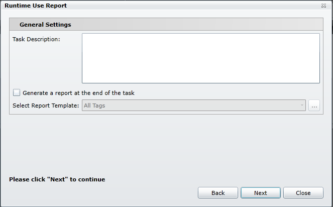 1. This opens the first screen of the Runtime Use Report Wizard window, as shown below. Upon first use, you can read through the description of the wizard. Click Next to continue.