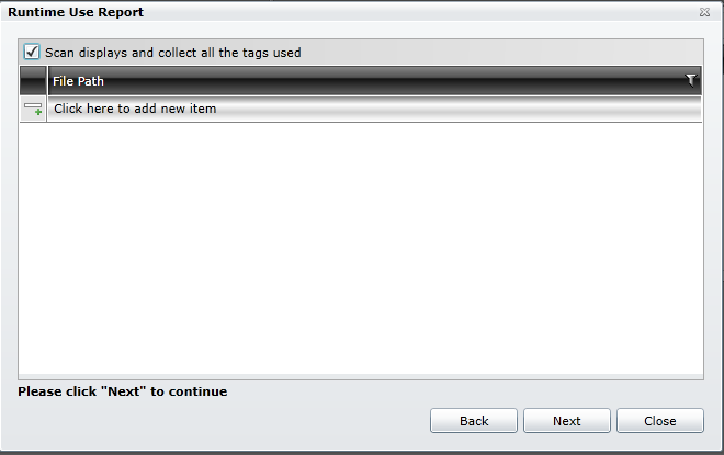 You can choose to click on the Scan displays and collect all the tags used checkbox. This will activate the File Path section below. Clicking on the Add button [] allows you to configure a path to your selected display file. You can enter the path directly in the text entry field or you can click on the ellipsis [...] button, which opens a file browser, allowing you to navigate to your selected display file. Once selected, the path will show in the File Path section of the window. Once you have added your selected display files, click Next to continue.